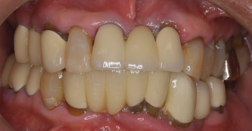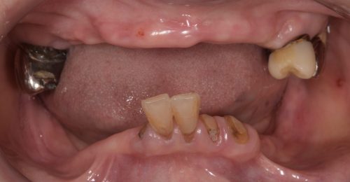 | 治療内容 | 前歯のブリッジが取れ来院。下顎臼歯のデンチャーも使っていない状態。歯周病も重度で上下顎でしっかり噛みたいとインプラントを希望。 |