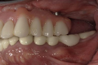 右上前歯が痛みがあり来院。本人の希望は入れ歯にはしたくない、歯がない時期があると困る、他院ではインプラントはできないといわれたとのことで、抜歯・インプラントオペ当日に歯まで入るオールオン4を希望。